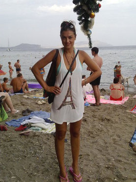 Девица надела на себя желтый купальник и отправилась в бассейн. Она хотела немного понежиться в теплой водичке под палящими лучами солнца. Когда рядом оказался партнер этой бабы, она тут же начала снимать с себя нижнее белье. Телочке захотелось чтобы мужик посмотрел на ее обнаженное тело. Она сняла с себя лифики и позировала перед партнером в одних трусиках.