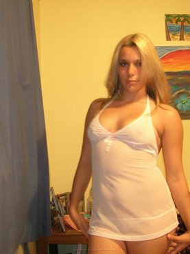 Блондинка решила устроить себе откровенную фотосессию. Милашка надела колготки в сетку и отправилась позировать в ванной. Показав перед камерой небольшие дойки, красотка возбудилась и продолжила менять позы. Вскоре давалка раздвигала ноги перед объективом и хвасталась растянутой пилоткой.