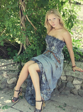 Брюнетка в майке и зеленых стрингах прогуливается по саду и, встав под одну из поливалок, принимает на себя множеством капель освежающей воды. Когда цыпочка с большими сиськами намокла, она вышла на небольшой балкончик расположенный в окружении растительности, и начала там хвастаться большой пятой точкой и аппетитными буферами.