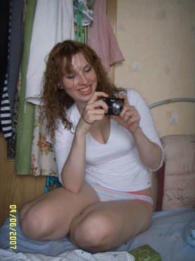 Молоденькая девушка с рыженькими волосами и интересной прической сразу обращает на себя внимание и не только потому, что она оголила сиськи, а ещё из-за своих больших зеленных глаз. Вообще, внешность у девицы очень неординарная и тем интересней наблюдать за действиями голой худышки, которые она совершает стоят перед зеркалом. Милашка явно хочет отправить эротическое послание бойфренду, ведь она написала фломастером его имя прямо на голом животике.